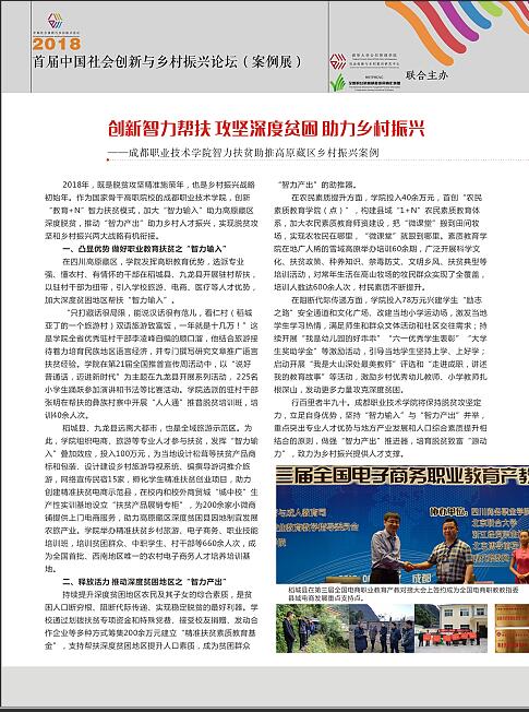 我院作为全国职业院校精准扶贫协作联盟发起单位、副理事长单位,在脱贫攻坚、乡村振兴战略中主动作为,坚持以服务地方经济发展为己任,积极响应中央、省市号召,立足高等职业教育优势,创新“教育+N”精准扶贫模式,以驻村帮扶、智力支持、教育培训、科技指导、产业发展为抓手,满怀真情做好稻城县、巴中恩阳区、九龙县的深度贫困帮扶工作,全心全意做好简阳市团岭村、大邑县同心村巩固提升工作,积极开展精准扶贫、乡村振兴工作,卓有成效。下一步,我院将深入贯彻十九大精神,保持脱贫攻坚定力,立足自身优势,坚持“智力输入”与“智力输出”并举,为打赢脱贫攻坚战、实施乡村振兴战略做出更大贡献。