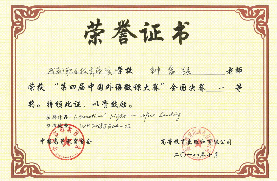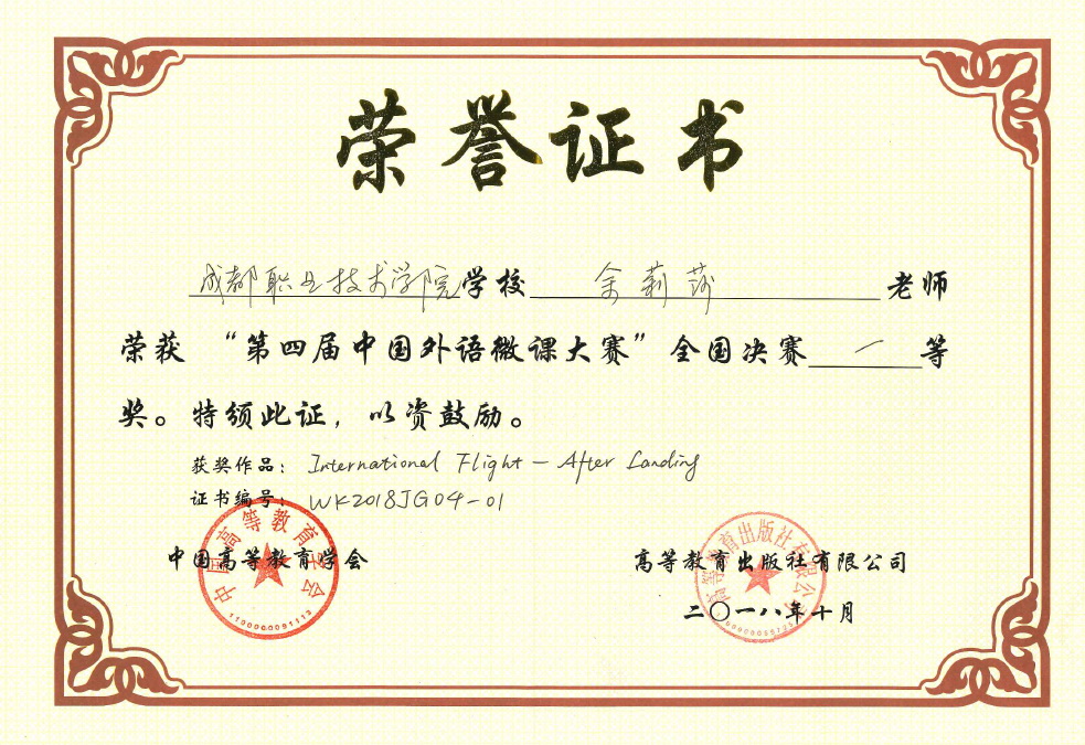 近日,第四届中国外语微课大赛颁奖典礼上传来佳讯,我院国际教育学院余丽莎、钟富强教师团队凭借参赛作品《International Flight - After Landing》,一路过关斩将,荣获全国决赛一等奖。余莉莎老师作为获奖教师受邀在颁奖典礼上发表获奖感言,对大赛的精心安排和周密组织表示衷心感谢,并阐述了参赛作品的设计想法和心路历程。