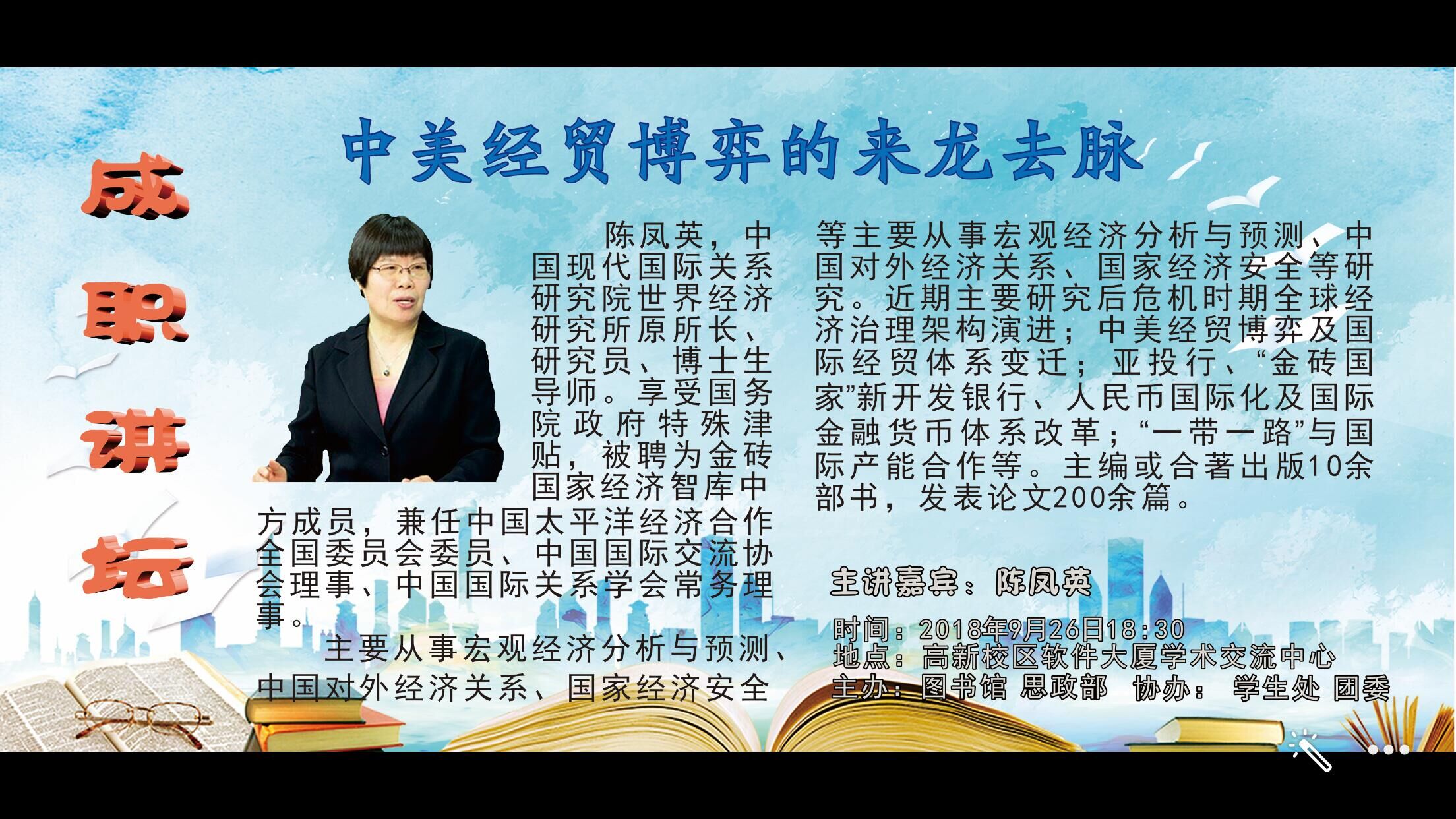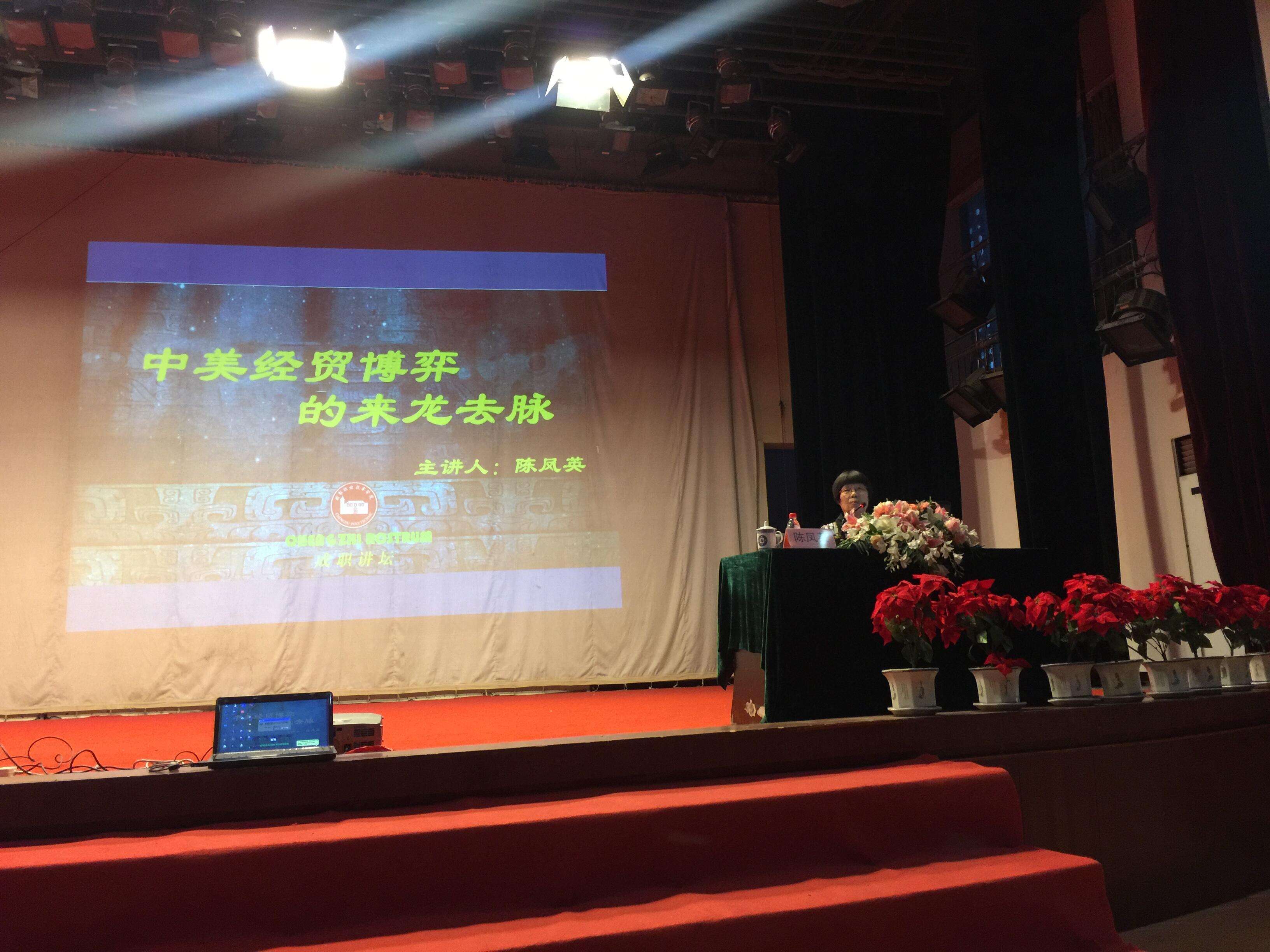 9月26日,中国现代国际关系研究院世界经济研究所原所长、研究员、博士生导师陈凤英教授应邀到我院成职讲坛作《中美贸易博弈的来龙去脉》专题讲座。学院党委副书记、纪委书记邹克俭代表院领导出席讲座,思政部主任蒋家胜教授、工会副主席张雪等相关处室负责人、师生代表500余人聆听讲座。图书馆馆长周红艳主持讲座。