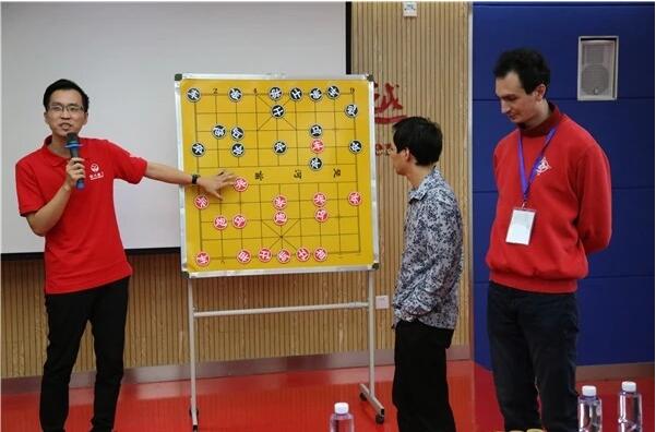 来自全球各地的16名外籍象棋棋手饶有兴致地参观了“书香棋韵体验馆”和棋艺学院后,在教学楼B405开展象棋国际培训会,学院副院级调研员杨仕清代表学院致欢迎词,世界象棋协会副秘书长、欧洲象棋协会秘书长薛忠主持本次培训会,象棋世界冠军、特级大师赵鑫鑫题为“棋艺进阶的三个阶段”的培训讲座为参加本次全球象棋双人赛的洋棋手们细致讲解如何精进棋艺、提升水平,为象棋技艺的全球推广、象棋知识的全球普及上了扎实一课。