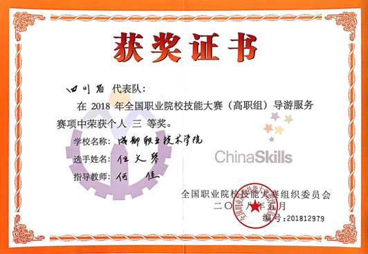 “导览天地四方,游论南京赛场”。为期三天的第五届全国职业院校技能大赛(高职组)导游服务赛项在中国江苏南京旅游职业院校隆重举行。我院导游专业参赛学生与来自全国109所职业院校的152名参赛选手同台竞技,经过“导游知识测试”“专题与自选讲解”“导游英语会话”“才艺展示”四个环节的激烈角逐,最终取得优异成绩。导游163—2班伍文琴与导游173—2班刘小铃同时获得本次国赛三等奖,我院也是四川赛区获奖项最多的院校,充分展现我院导游专业在中国西部地区高职院校中的示范引领地位。