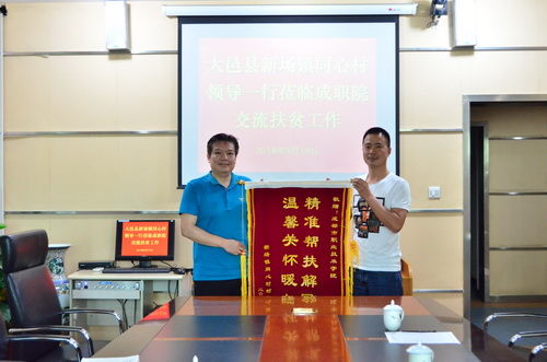 2018年5月16日,大邑县同心村党支部书记何万川、村主任陈丽一行来到成都职业技术学院赠送锦旗,并进行交流座谈。学院党委副书记、院长王涛出席座谈会并讲话。学院党政办主任何涛、同心村驻村第一书记陈宜华等参加座谈会。