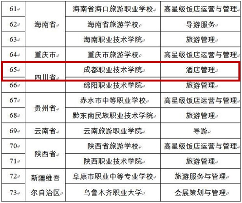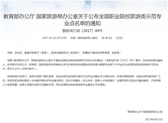2017年7月,教育部职业教育与成人教育司发布《关于全国职业院校装备制造类、邮政和快递类、旅游类、交通运输类示范专业点名单的公示》,确定了344个全国职业院校有关专业类示范专业点。2017年10月,教育部办公厅、国家旅游局办公室发布《教育部办公厅、国家旅游局办公室关于公布全国职业院校旅游类示范专业点名单的通知》,我院旅游分院酒店管理专业光荣在列。此次全国职业院校旅游类示范专业点的评选是在各地申报的基础上,经专家评议和公示,教育部、国家旅游局共同确立的。