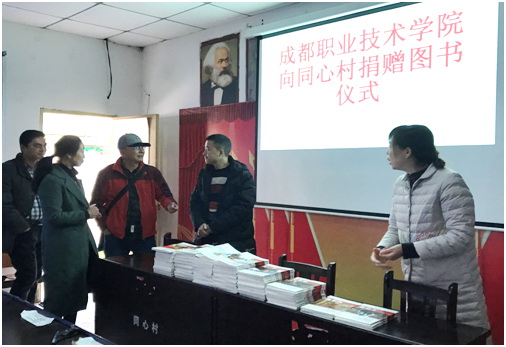我院图书馆积极学习宣传贯彻落实党的十九大精神,积极参与学院精准扶贫对口帮扶工作,配合学院推动大邑县新场镇同心村精准扶贫工作。12月22日,我院图书馆援建的“成职微图书馆”在大邑县新场镇同心村正式启动。图书馆周红艳馆长、图书馆部分老师、我院派驻大邑县同心村书记陈宜华以及同心村干部出席了捐赠仪式。