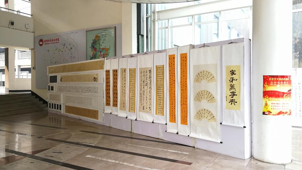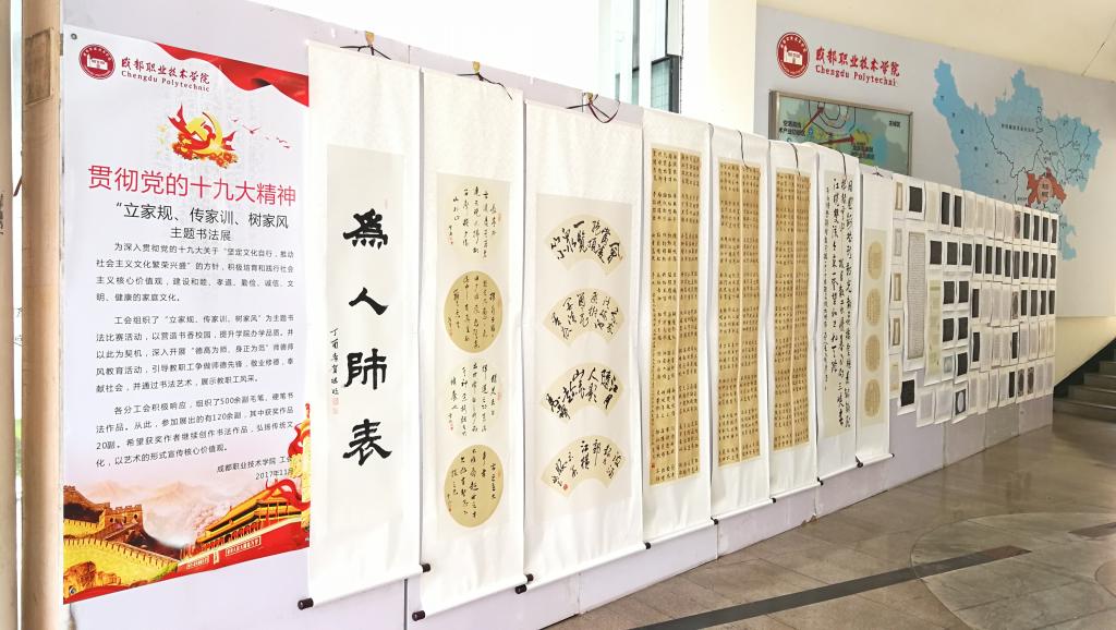 为深入学习贯彻党的十九大关于“坚定文化自信,推动社会主义文化繁荣兴盛”的精神,积极培育和践行社会主义核心价值观,建设和睦、孝道、勤俭、诚信、文明、健康的家庭文化。工会组织了“立家规、传家训、树家风”主题书法比赛,营造书香校园,丰富教职工文化生活。并以此为契机,深入开展“德高为师、身正为范”师德师风教育活动,引导教职工争做师德先锋,敬业修德,展示教职工风采。本次比赛共收到500余幅毛笔、硬笔书法作品。工会从中选出120余幅作品参展,其中获奖作品60幅。