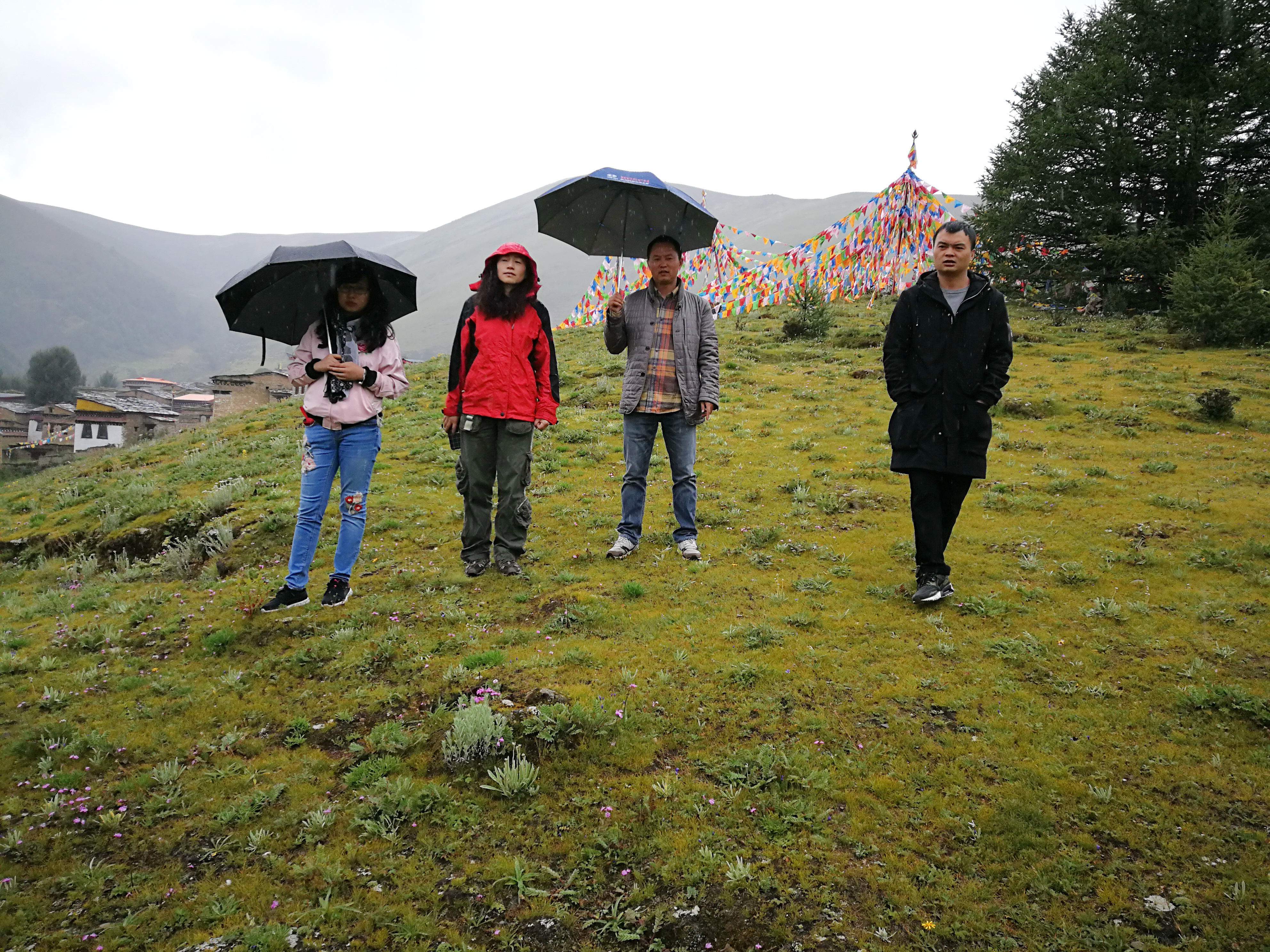 在傍河乡副乡长鲜勤翔、寺管所白玛汪扎和我院驻村帮扶干部李凌峰的陪同下,两位老师克服高原反应,到稻城县傍河乡自麦经堂、青杨之母、扎郎寺、自龙草原(黑帐篷基地、登秋节举办地)玛尼堆长廊、断桥等旅游点位实地踏勘,听取旅游资源情况介绍,并与县脱贫攻坚办、傍河乡政府的负责同志就旅游标识标牌设计、傍河乡一日游线路设计等问题进行了深入交流。