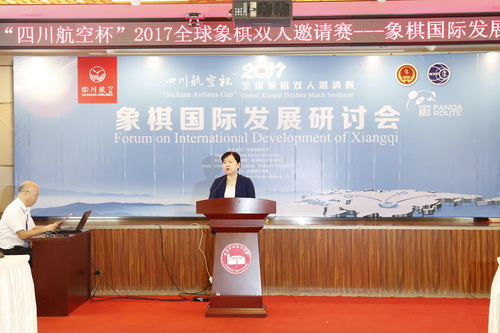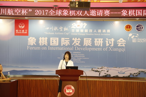 陈泽兰首先感谢主办方把研讨会放在这么有棋类文化氛围的成都职业技术学院(成都棋艺学院),并表示自己是第三次来到这里,每一次都被学院内独具匠心的棋类文化氛围所感染。而后她代表国际智力运动联盟、世界象棋联合会,向研讨会的举办表示祝贺,向成都市政府、成都棋院,以及与会来宾对象棋事业发展的关心和支持,致以谢意。
