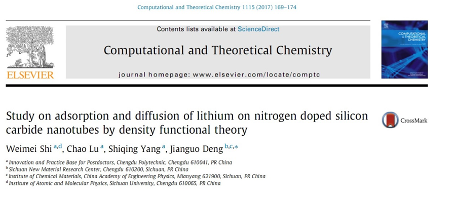 近日,我院博士后创新实践基地专职博士后史卫梅博士、卢超博士在国外知名SCI源学术期刊 《Computational and Theoretical Chemistry》 发表论文 “Study on adsorption and diffusion of lithium on nitrogen doped silicon carbide nanotubes by density functional theory”,论文第一署名单位为成都职业技术学院,通讯作者单位为中国工程物理研究院,该研究是在国家973计划子项目“锂离子电池高压富镍型三元正极材料的改性制备和锂传导机理研究”的资助下完成的,是我校积极开展校院合作、实施军民融合举措以来所取得的又一项优秀成果。