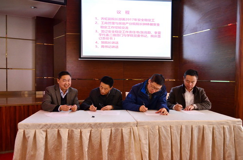 学院院长贺继明对2017年安全稳定工作提出三点要求,第一、明责任。每年全院教职工与学院签订安全稳定工作目标责任书,级级分解责任,层层压实责任,特别是重点部门、关键岗位必须责任到人,严格执行安全管理“党政同责、一岗双责、齐抓共管、失职追责”制度。第二、勤检查。全院各分院部、处室、校区必须将安全稳定检查形成制度,而且要将检查制度落到实处,开展经常性地检查,做好隐患排查的台账,发现隐患一定要及时整改,特别是食堂、学生宿舍等是很容易发生火灾事故重点防范区域,我们必须加强消防安全排查;同时,教职工每天下班、放假离校前必须逐一检查办公场所的安全。第三、严处罚。在开展各种安全稳定隐患排查过程中,一旦查出问题,核实具体责任人,必须重处,除处理直接责任人以外,还要在年终目标考核时扣部门的绩效考核奖。