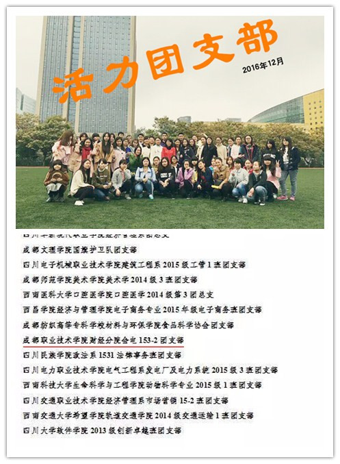 2016年12月28日,由团中央学校部组织开展的高校共青团“活力团支部”创建遴选活动结果揭晓。我院财经分院会计电算化153-2支部以出色的班风、学风、团组织作风,在全国12000余个参加评选的团支部中脱颖而出,被评为全国高校“活力团支部”。