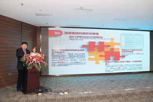 我院副院级调研员、博士生导师杨仕清教授围绕学院近年来的信息化建设研究与成果做了题为《信息化创新引领职业教育变革》的主题报告。杨教授从项目概况、基础设施建设、共建共享机制建设等方面介绍了我院承担的教育部第一批教育信息试点项目的工作经验,并提出下步工作目标。