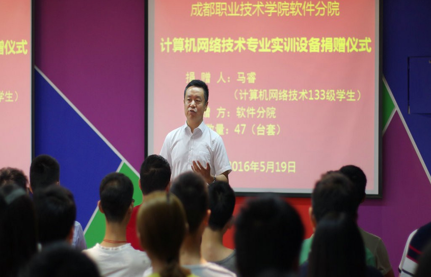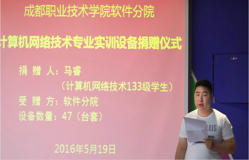 2016年5月19日,我院133级计算机网络专业学生马睿向软件分院捐赠实训设备的捐赠仪式在软件大楼四楼云创空间举行,软件分院全体师生见证了这一刻。