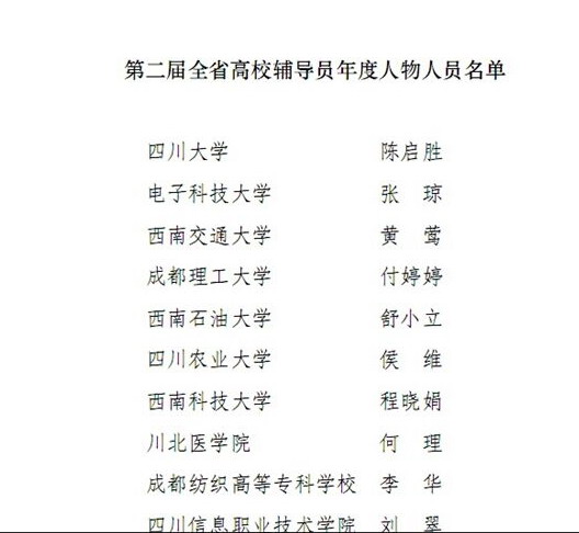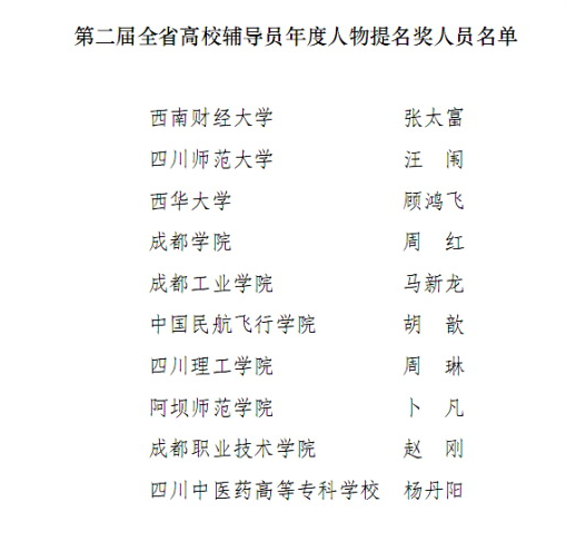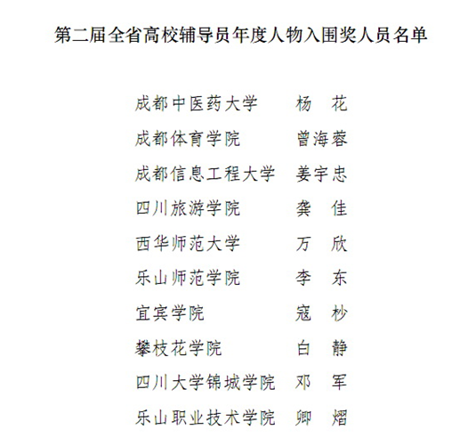 本次评选活动由四川省高校思想政治工作研究会主办,报省教育厅同意,旨在引导广大辅导员进一步提高思想政治素质,创新工作方式方法,增强做好大学生思想政治教育工作的责任感使命感,不断加强辅导员队伍专业化、职业化建设。活动最终评选出“第二届四川省高校辅导员年度人物”、提名奖和入围奖各10名。
