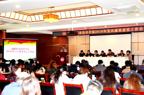 3月21日,成都职业技术学院召开2016年党风廉政建设工作会。会议主要内容是学习贯彻十八届中央纪委六次全会、省纪委十届五次全会和市纪委十二届七次全会精神,总结2015年、部署2016年学院党风廉政建设工作和反腐败工作。学院领导班子成员,全院科级以上干部、系主任、党员代表、教师代表、职工代表83人出席会议。党委书记周鑑,党委副书记、院长贺继明讲话,党委副书记、纪委书记凌红主持会议并总结部署工作。