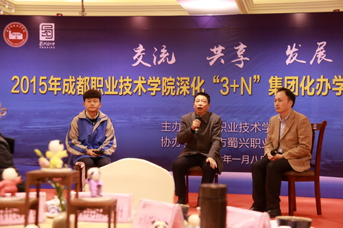 成都市蜀兴职业中学校长刘泸生和四川省新津县高级职业中学副校长叶丰平分别对过去一年的“3+N”集团化办学进行总结。在《春暖花开》优美的旋律中,我院工房分院院长王德林、蜀兴职中电商专业组长赖启军、学生代表孙信珽分享了在我院成都国际商贸城“城中校”的电商专业实训项目中的经验、收获与感悟。通过单独招生成功考入我院的蜀兴职中毕业生代表陈慧翎、钟方玉、胡颜,以“我们正青春”的激情演讲,展示了通过中高职衔接实现大学梦的成长之路。