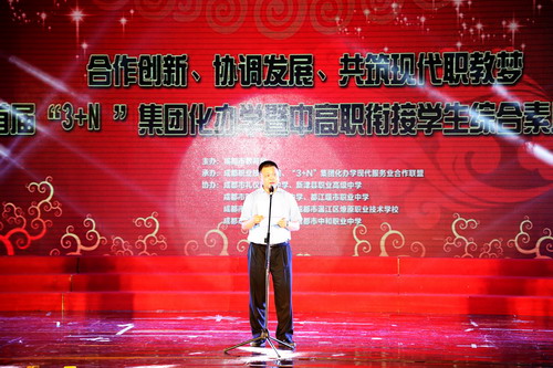 6月5日,由成都市教育局主办,成都职业技术学院、“3+N”集团化办学现代服务业合作联盟承办的首届“3+N”集团化办学暨中高职衔接学生综合素质展演在学院高新校区学术交流中心举行。本次活动旨在全面展示当代中高职学生朝气蓬勃的精神风貌,有效增强中高职衔接、集团化办学的凝聚力、号召力和影响力,为学生成长成才营造良好的思想氛围和文化氛围,全面推进中高职衔接学生综合素质培育工程。成都市教育局党组副书记、副局长姚凯,成都市教育局职成处处长万斌,我院党委书记周鑑,副院长王涛,温江区燎原职业技术学校校长毛亚风、副校长杨浪,成都市蜀兴职业中学校长刘泸生,新津县职业高级中学副校长雷敏、叶丰平,成都市礼仪职业中学副校长张超,成都财贸职业高级中学副校长成强,成都市华阳职业中学副校长周华军,都江堰市职业中学副校长杜学君,成都市中和职业中学职高部主任彭勇等出席本次活动。