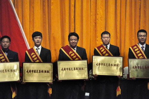 4月22日,成都市召开劳动模范表彰大会,隆重表彰为全市社会发展和经济建设作出突出贡献的劳动模范、模范单位和模范集体(班组)。我院旅游分院获得成都市模范集体(班组)荣誉称号。学院副院长、工会主席李王英参会,旅游分院赖斌院长上台领奖。旅游分院20多名学生为大会志愿礼仪服务,靓丽形象、高标准服务、表现出色,受到与会领导亲切慰问并合影留念。