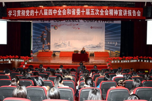 按照省委统一部署,12月11日下午,四川省委宣讲团高校宣讲分团到我院宣讲党的十八届四中全会和省委十届五次全会精神,省委宣讲团成员、省委党校法学教研部主任赵明教授作宣讲报告。学院党委书记周鑑主持会议并讲话。学院领导、科级以上干部、思想政治理论课教师、辅导员、学生450余人聆听宣讲会。