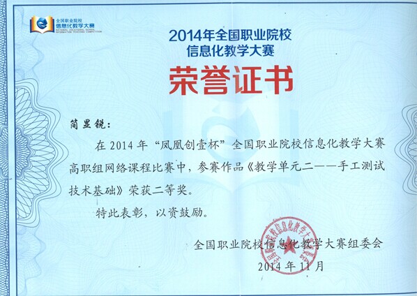 2014年全国职业院校信息化教学大赛历经八个月的激烈竞争,近日落下帷幕。软件分院简显锐老师经学院选拔、四川省教育厅推荐,代表四川高职院校参加了全国职业院校信息化教学大赛,其参赛作品《教学单元二——手工测试技术基础》荣获全国二等奖。