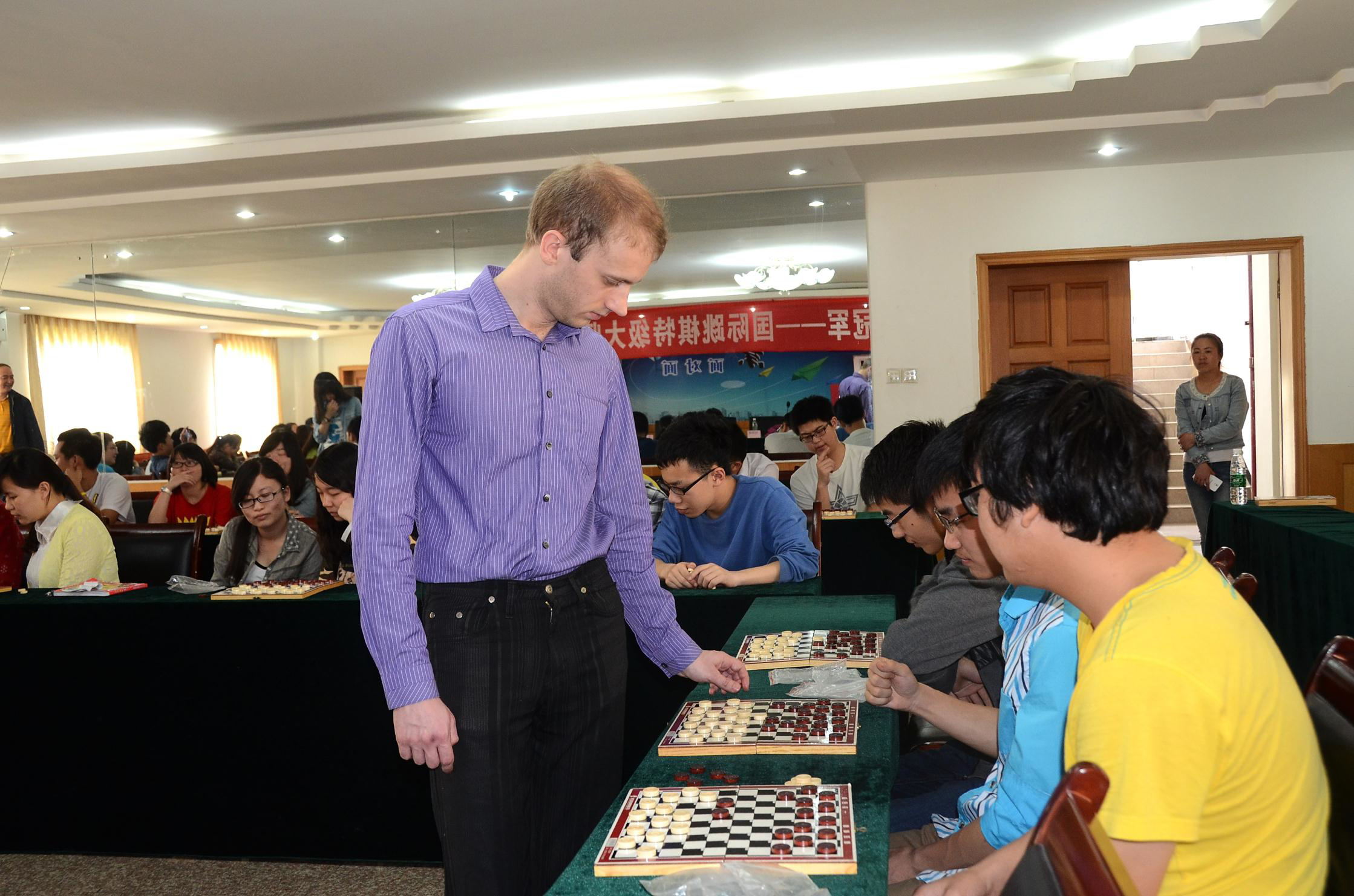 活动现场,尤里大师为到场的60多名同学献上了一场精彩的国际跳棋知识讲座。随后还与我国国际跳棋大师、我院棋艺专业学生周伟、廉博一起,同在场的同学们进行了一场国际跳棋车轮战,指点棋艺。