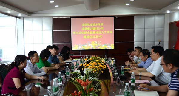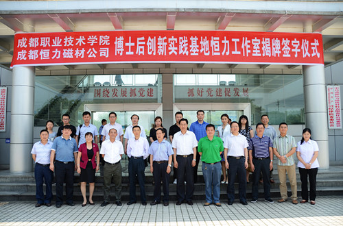 学院博士后创新实践基地恒力工作室揭牌仪式于5月21日在成都恒力磁性材料有限责任公司举行,此举标志着国内首家高职院校博士后创新实践工作室联姻企业并正式运行。学院党委书记周鉴,新津县委常委、组织部部长丁钰,县委常委、副县长左正洪出席揭牌仪式。
