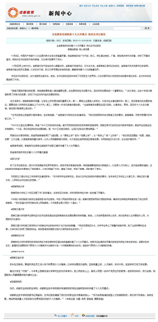 此外,成都日报、教育导报、成都教育网等三家媒体也相继对我院师生观看十八大进行了报道。