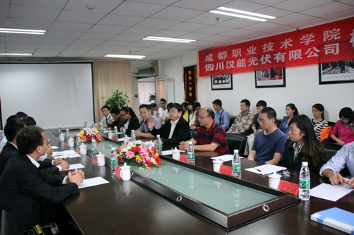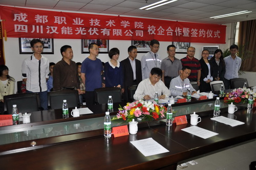 2012年9月24日下午,四川汉能光伏有限公司与成都职业技术学院校企合作签约暨启动仪式在我院高新校举行。四川汉能光伏有限公司总工兼运营总监林进达、人力资源部培训经理齐花蕊、生产部经理林超胜、厂务部经理冯均、人事招聘主管周勇、我院副院级调研员杨仕清教授出席了启动仪式。软件分院院长李亚平教授主持了仪式。