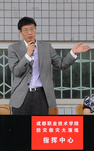 青羊校区大演练总指挥何小婉副书记在讲话中指出,近年来,学院坚持贯彻“以人为本”的方针,将防灾减灾与学院加快发展同规划、同部署、同实施,成功地应对了5.12汶川特大自然灾害,维护了广大师生生命财产安全。全院上下发扬伟大的抗震救灾精神,积极参与灾后恢复重建,顺利完成花源校区建设,高位起跳,掀开了学院国家骨干高职院校和省级示范高职院校建设新篇章。