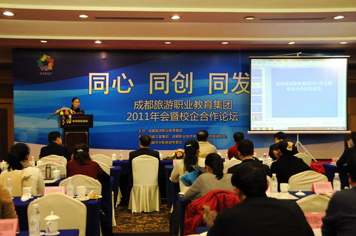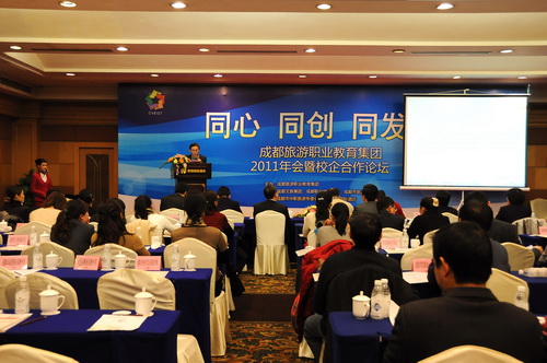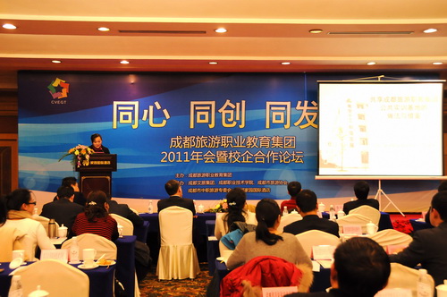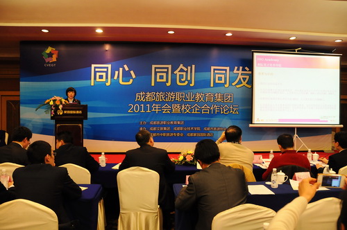 成都旅游职教集团2011年会举办了校企合作论坛,校企与会代表瞄准“产业成都、天府新区”建设,围绕集团明年深化体制机制、中高职衔接标准化体系建设和社会服务能力与国际化水平的三大着力点开展主题演讲。论坛由成都职业技术学院旅游分院院长赖斌和成都文旅集团人力资源部总经理黄剑鲲共同主持。