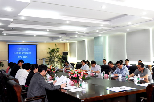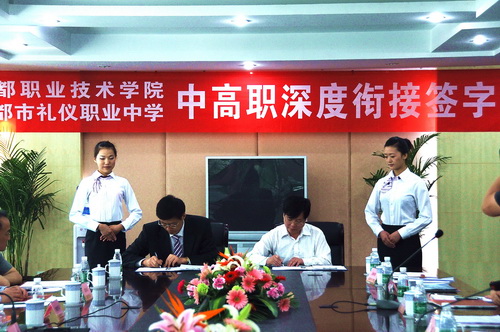 5月26日上午,我院举行市教育体制改革试点项目中高职衔接签字仪式。学院党委副书记、院长贺继明与成都市礼仪职业中学校长唐开平签署了《关于中高职深度对接,协调发展合作的战略框架协议》。