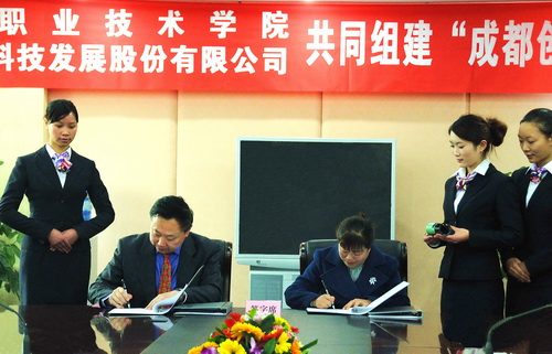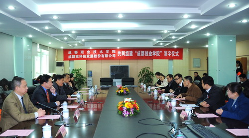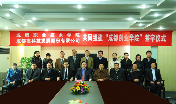 2010年12月31日,我院与成都高科技发展有限公司在高新校区举行“成都创业学院”项目启动签字仪式,共同组建股份制创业学院,创新地方高职院校服务创业工作新的机制体制,建立全新“教育+企业”创业孵化平台。共青团成都市委副书记邱伟,联合国国际劳工组织北京及蒙古局官员、中国创业培训工作指导委员会专家赵伟,省就业训练中心主任龙树贵及省教育厅、团省委、市人力资源和社会保障局、市教育局、成都菲斯特科技有限公司等领导和嘉宾出席签字仪式。成都高科技发展股份有限公司总裁高利军、学院党委书记周鉴、党委副书记兼纪委书记何小婉出席签字仪式,副院长王涛主持仪式。