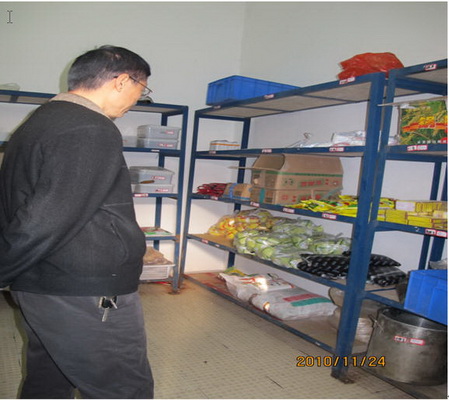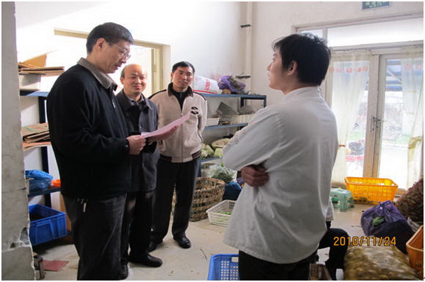 随后贺院长又来到学生食堂,仔细检查了糕点加工房、食堂储藏间及操作间的食品卫生安全。在糕点加工房,贺院长检查了对食堂工作人员的上岗证、健康证等相关证件,对糕点制作和销售时间进行了仔细询问。在查看食堂储藏间和操作间的卫生状况之后,他还详细检查了餐具清洗、碗筷消毒、原材料库房管理、食品加工流程、食品保质期、食品采购来源等各个环节,并针对发现的问题,要求有关部门立即进行整改,将安全隐患消灭在萌芽阶段。贺院长强调,一定要高度重视食堂的食品卫生安全,严把质量关,要卫生、要新鲜,价格要尽量低一点。