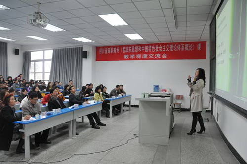 来自四川农业大学、泸州医学院、电子高专、成都职业技术学院、四川职业技术学院的四川省思政课“精彩一课”比赛一、二等奖的获奖者分别进行了《毛泽东思想和中国特色社会主义理论体系概论》、《思想道德修养与法律基础》、《形势政策课》的示范教学,我院思政课教师、省“精彩一课”一等奖获得者李丹老师上了题为《社会主义初级阶段分配制度》的示范课教学,受到与会教师好评。与会教师通过观摩加深了对教材的理解、对教学艺术的体验,在教学内容处理、教材体系如何转化为教学体系、教学如何与高职高专学生特点结合等方面也颇有收获。思想政治课教育专家罗映光、刁纯志、吴敏英、邓淑华、余勇等对教师们的教学进行了精彩点评,通过示范与点评,教师们对进一步提升思想政治理论课教学水平充满激情。