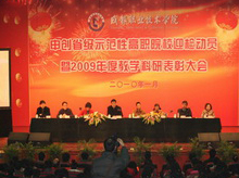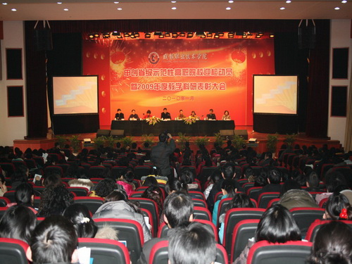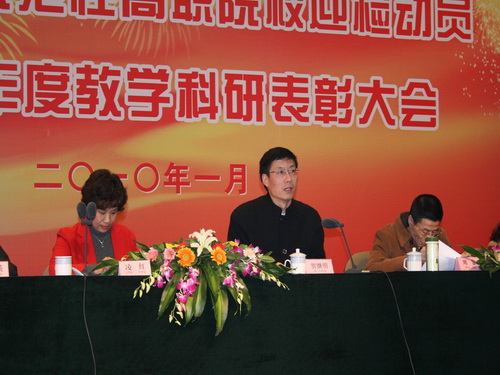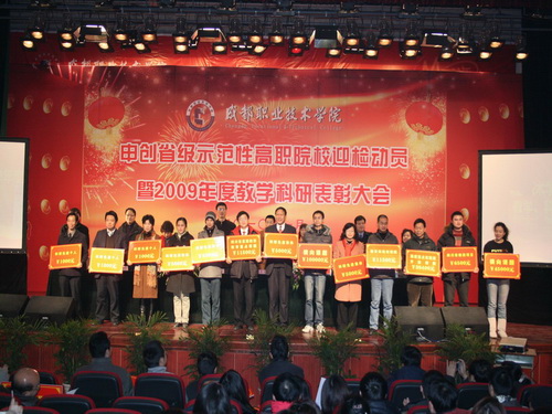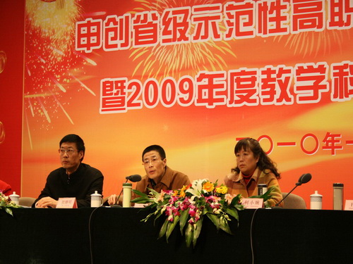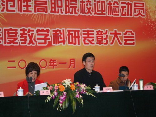 1月15日,学院隆重召开“申创省级示范性高职院校迎检动员暨2009年度教学科研表彰大会”。学院领导班子出席了会议,党委书记周鉴,党委副书记、院长贺继明在会上作了重要讲话,纪委书记、党委副书记何小婉宣读了2009年度教学科研表彰名单,党委副书记、副院长凌红主持了会议。全体领导为获奖单位和个人颁奖。