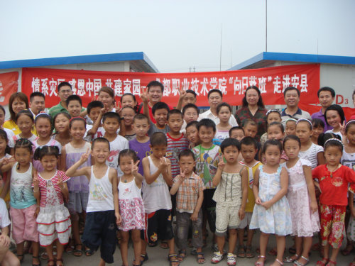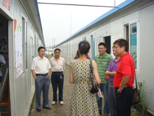 紧接着检查小组一行便奔赴前往彭州龙门山镇宝山村灾民安置点。我院工商管理与房地产学院的同学们去年已经在这个安置点开展了志愿活动,他们有序、细致的服务给当地居民留下了非常良好的印象。今年听说志愿者们又要来,村民们都高兴地为他们腾出空房间来。在潮湿闷热的板房区中,志愿者们再次搭建起充满了爱与希望的“育才学堂”,并在附近的几个板房区开展了学生招募活动,并举行开班仪式,并成功地举行了“乡村送温暖”科普宣传暨专利项目推介会,为当地村民送去了有效的科普宣传材料。这支志愿服务队不仅开展了支教活动,还通过教授舞蹈,编排表演节目等丰富村民的文化生活。王涛副院长鼓励大学生们要尽力多做一些实在的事情,为灾区的重建奉献我们的青春和热血。