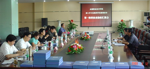 5月12日下午,中共成都市第七纪工委副书记王春霞,第七纪工委专员、中共成都市委深入学习实践科学发展观第七指导检查组组长刘忠志莅临我院,对学院深入学习实践科学发展观活动第一阶段工作检查验收,指导学习实践活动。
