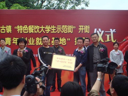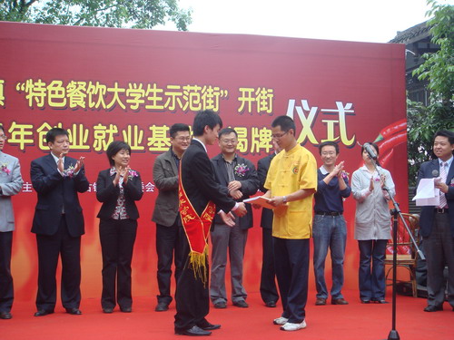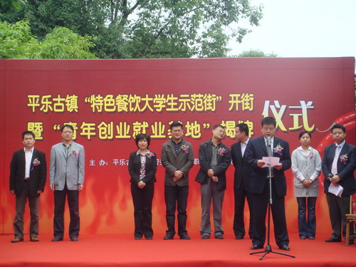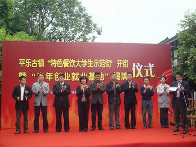 邛崃市副市长邓蔚在仪式上说,打造“特色餐饮大学生示范街”,建立“青年创业就业见习基地”是对中组部、团中央、教育部启动“一村一名大学生”计划的落实,是深入推进“一店一名大学生”项目的具体体现,是实现平乐古镇旅游可持续发展的创新性举措。通过打造“特色餐饮大学生示范街”和建立“青年创业就业见习基地”,既为高职学生提供工学交替的实践机会,同时通过古镇片区联动,提升旅游服务整体服务水平,打造古镇旅游精品,实现政企校共赢。