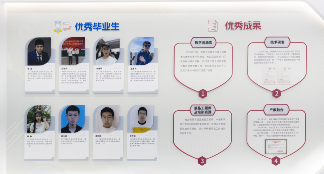 近三年,智能光电技术应用专业与企业联合的“成职-京东方产教科深度融合及协同创新示范应用”项目获川渝产学研创新成果二等奖,教师获教学能力大赛、职工组技能大赛等省级以上获奖12项,学生参加各类大学生技能竞赛省级以上获奖60余项。2022年,学校《校企耦合 协同共育光电信息产业技术技能人才—成职-京东方共建人才培养基地实践案例》入选全国2022年产教融合优秀典型案例。厂校融合共建光电信息产业“厂中校、校中厂”获四川省教育厅产教融合典型案例。