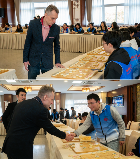本次活动的最大亮点无疑是车轮战环节。柯棋斯基大师同时面对10名象棋学子和10名国际象棋学子,展开了一场高强度的智力对决。在有限的比赛时间内,他展现出非凡的棋艺与耐力,最终取得19胜1负的卓越战绩。值得一提的是,棋艺学院大一学生、国际象棋棋联大师钟康民也参与协助,增添了比赛的互动性与专业性。