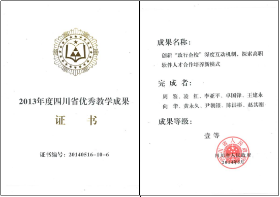 《创新“政行企校”深度互动机制,探索高职软件人才合作培养新模式》获四川省优秀教学成果一等奖,国家级教学成果二等奖 《融入产业园区构建高职软件人才培养模式的研究实践》获四川省教学成果奖第六届高等教育教学成果奖三等奖 专著《高职软件教育园区化办学理念与实践研究》获四川省第十六次社会科学优秀成果三等奖