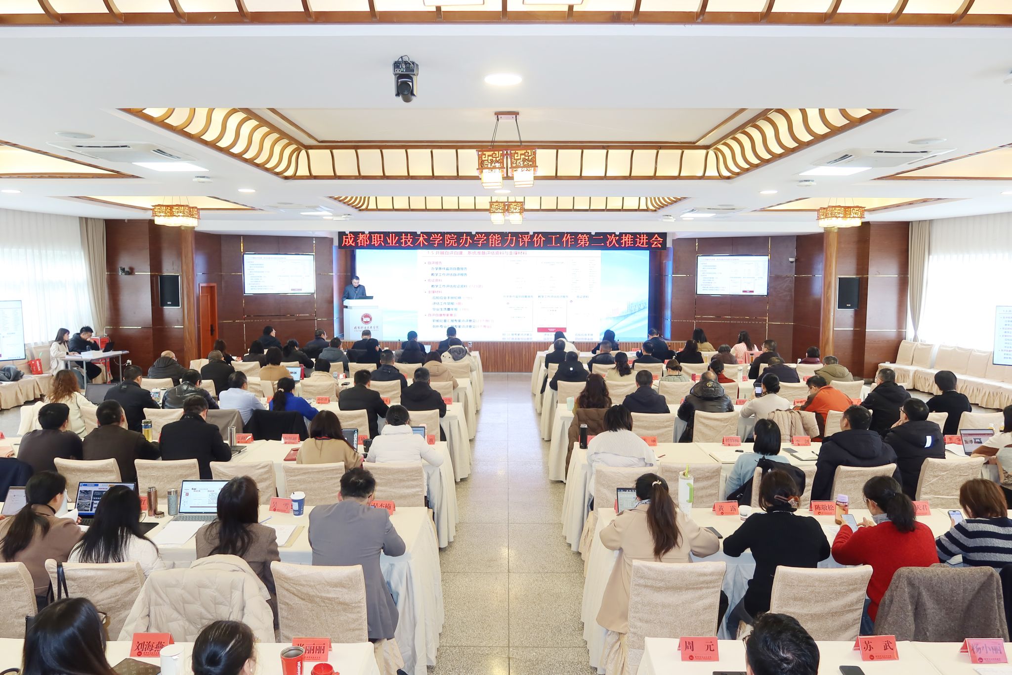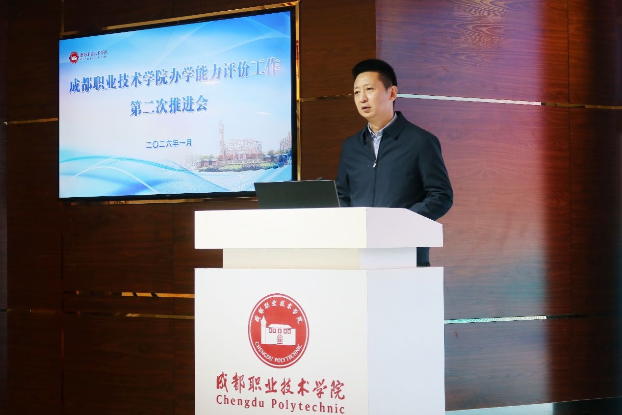 1月27日下午,学校在棋艺学院多功能厅召开办学能力评价工作第二次推进会。学校党委书记陈大勇出席会议并发表讲话,校长赵艳艳、全体在家校领导出席会议。四川省教育厅副总督学、教育督导与审计处处长王运芳,重庆工商职业学院副校长罗晓良,重庆电子科技职业大学教务处处长童世华莅临指导。全体副处级及以上干部参加会议。会议由学校党委委员、副校长叶安胜主持。