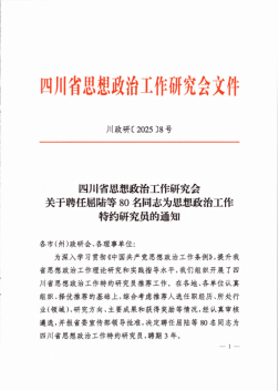 近日,四川省思想政治工作研究会发布《关于聘任屈陆等80名同志为思想政治工作特约研究员的通知》(川政研〔2025〕8号),我校教务处李丹处长成功受聘,聘期三年。此次聘任旨在深入学习贯彻《中国共产党思想政治工作条例》,进一步充实全省思想政治工作理论研究与实践指导专家力量。