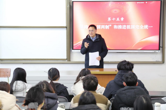 党委委员、副院长叶安胜以“坚持‘一国两制’ 和推进祖国完全统一”为题,系统阐述党中央关于港澳台工作的大政方针,通过翔实案例展现“一国两制”在香港、澳门的成功实践,引导学生坚定维护国家主权和领土完整的坚定决心,强化国家意识与爱国情怀。