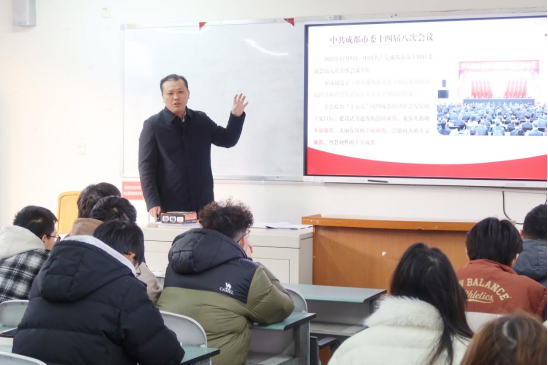 党委委员、副院长任忠围绕“学习宣传贯彻省委十二届八次全会精神”进行专题讲授,深入解读四川省未来发展的战略部署和重点任务,结合学校专业特色分析四川在成渝地区双城经济圈建设中的机遇与挑战,鼓励学生将个人发展融入四川现代化建设大局,为治蜀兴川贡献青春力量。