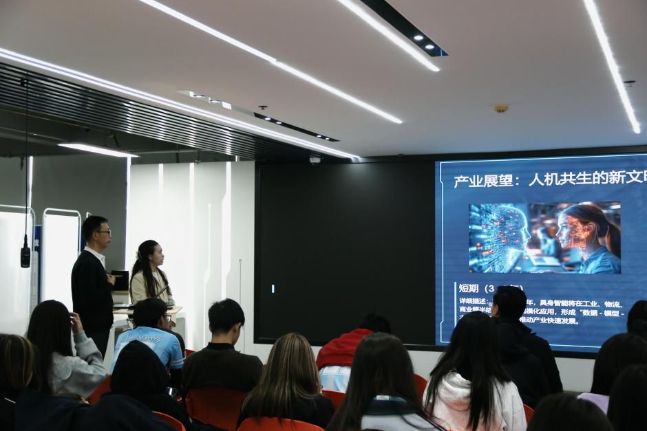 游戏过后,科普夏令营的专业宣讲环节正式开启。李爱民老师带来“智联万物,动见未来——具身智能的探索与实践”专题讲座,依托学校国家双高专业群的建设成果与教学积淀,深入浅出介绍我国具身智能发展现状,详细讲解人工智能技术应用专业的建设概况、教学特色与实践成果。讲座既展现了中国在人工智能领域的蓬勃发展活力,也彰显了学校在该领域的前沿探索与教学实力,让泰国师生对具身智能技术及职业教育发展有了系统认知。