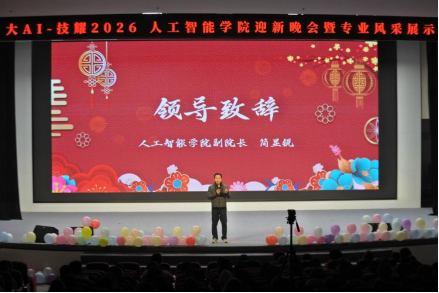 晚会伊始,人工智能学院副院长(主持工作)简显锐为晚会致辞。他深入阐述了人工智能大模型技术对未来专业发展的深远影响,勉励同学们秉持科技热忱,将个人理想融入国家人工智能发展战略大局,以务实进取的姿态书写新时代青年的奋斗篇章,并向全体学生致以诚挚的新年祝福,为整场活动奠定了积极奋进的基调。