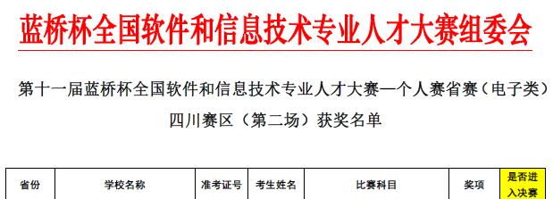 近日,由四川省教育厅主办的2020年四川省大学生软件和信息技术专业人才大赛落下帷幕,我院参赛选手荣获一等奖1项、二等奖2项、三等奖1项。
