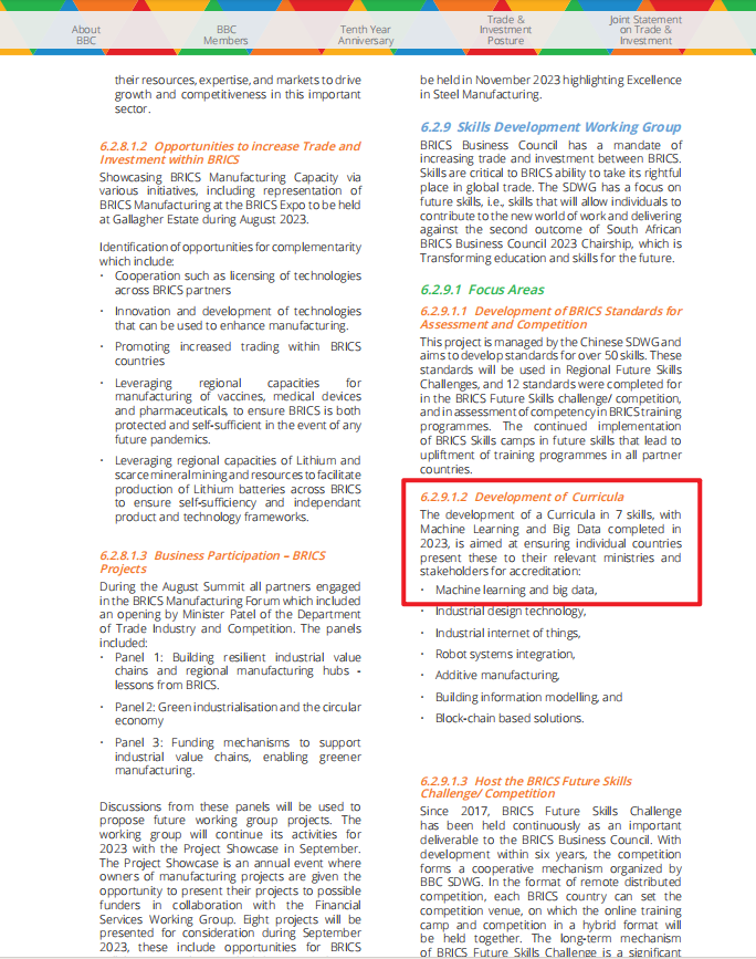 金砖国家“机器学习与大数据”未来技能课程开发和国际团体标准作为成果设计,被写入2023年度的金砖国家工商理事会年度工作报告,于今年8月22日-24日在南非约翰内斯堡举行的2023年金砖国家领导人峰会中,呈报给习近平总书记及金砖国家各国最高领导人。