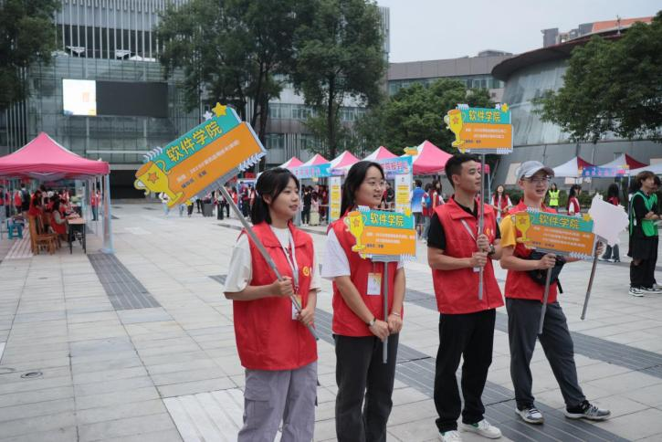 软件学院党总支书记方宁亲临现场全程指导,协调各项工作,各专业的辅导员老师现场答疑办公,骄阳似火,老师和志愿者们不惧酷热,顶着烈日为新生服务,校园中各处可见志愿者们为新生奔波的身影,搬运行李、解答疑惑、流程引导,还专门设有导示牌,方便新生和家长快速高效完成入学报到。并且我院还为家长专门设立了休息救助区和行李放置处,给家长和新生们最舒适的入学体验。