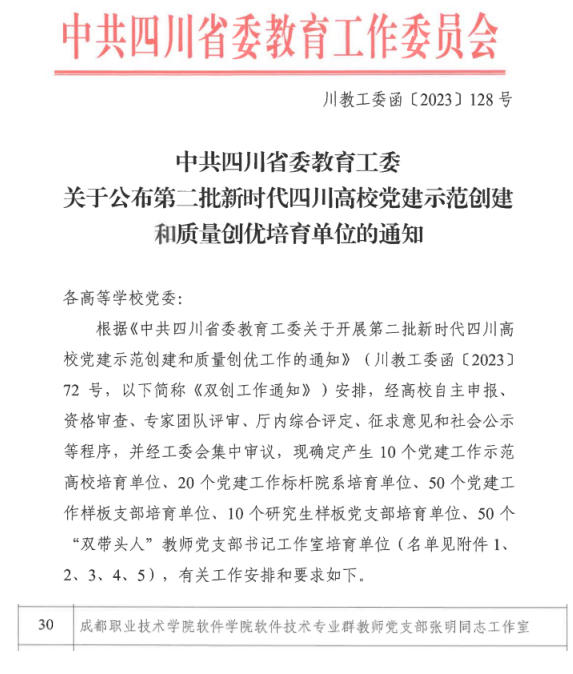 近日,四川省教育厅公示了第二批新时代四川高校党建示范创建和质量创优工作遴选结果,软件学院软件技术专业群教师党支部张明同志工作室成功入选“双带头人”教师党支部书记工作室培育单位。